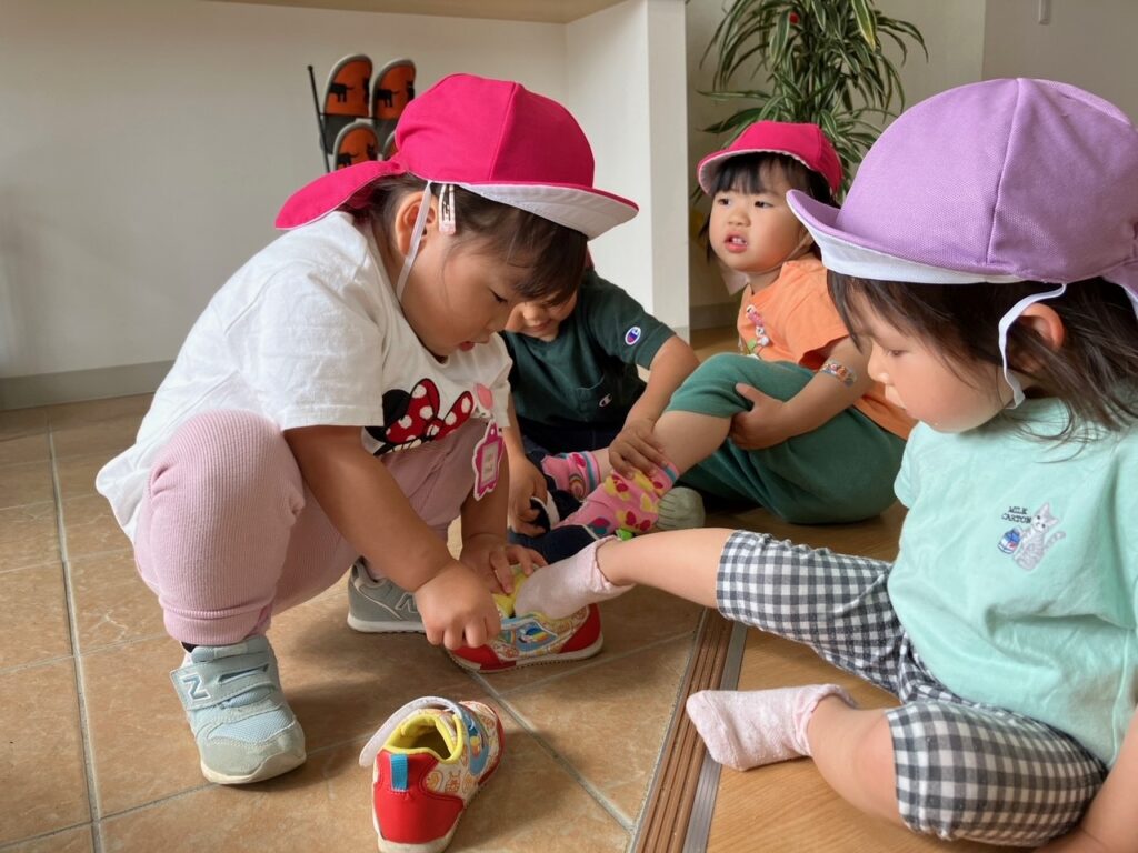小さな子の靴を履かせてあげるやさしいお友だちもいます。昨年までは履かせてもらっていたのに…成長を感じます😭