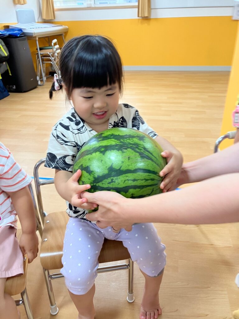 大きなすいかを目の前に、匂を嗅いだり叩いたりと目をキラキラ✨させていた子ども達。ぱんだ組のお友だちも一人で持とうと頑張っていましたよ😊