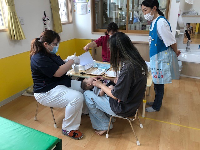 6月は4日の6(む)4(し)の語呂合わせから「虫歯予防の日」といわれているということで、こども園でも歯科検診が行われました🦷 小さなお友だちは抱っこで、大きなお友だちはひとりで立って口を大きく開けて診ていただきました。園では給食後にフッ化物洗口を行っていますが、はみがきも習慣化して虫歯0を目指していきたいですね😁✨