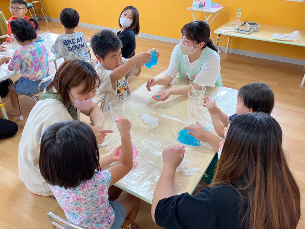 ぞう組はスライムづくりと触れ合い遊びをしました。材料を混ぜるとスライムになる変化に子ども達は興味津々、ボール運びでは落とさないように親子で息を合わせて頑張りました