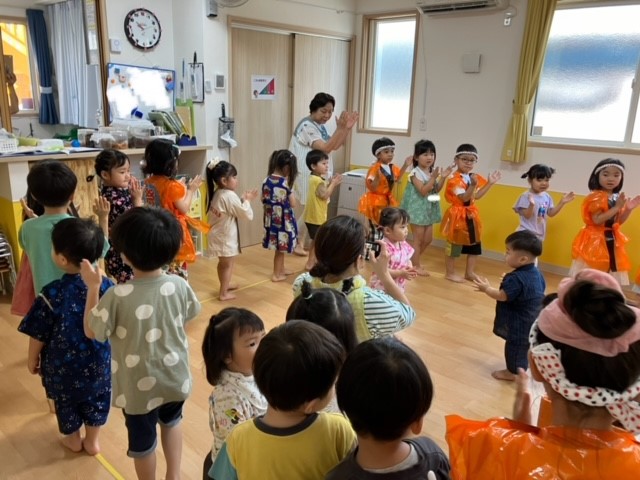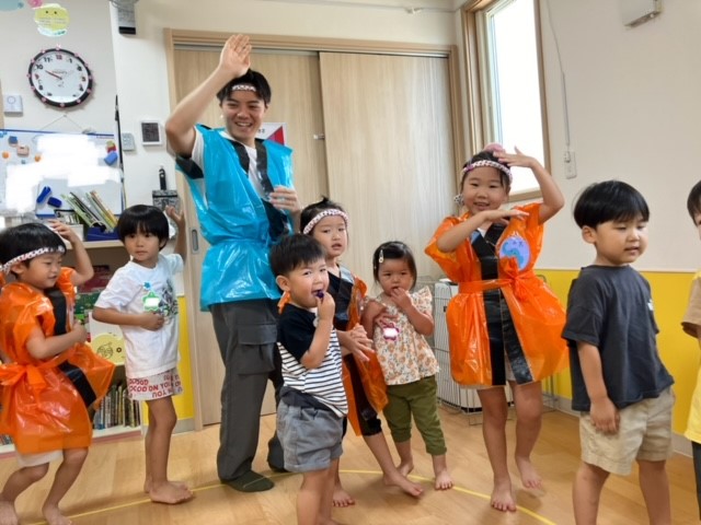 「もったいないばあさん」の盆踊りでは、小さなクラスのお友だちも口ずさみながらみんなで元気いっぱい踊りました🎵