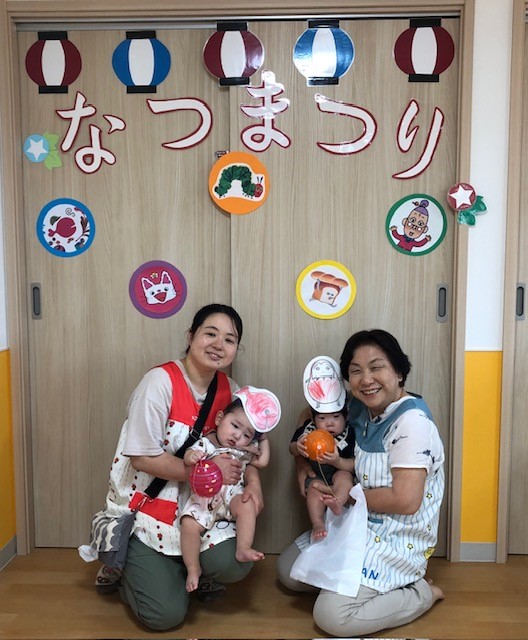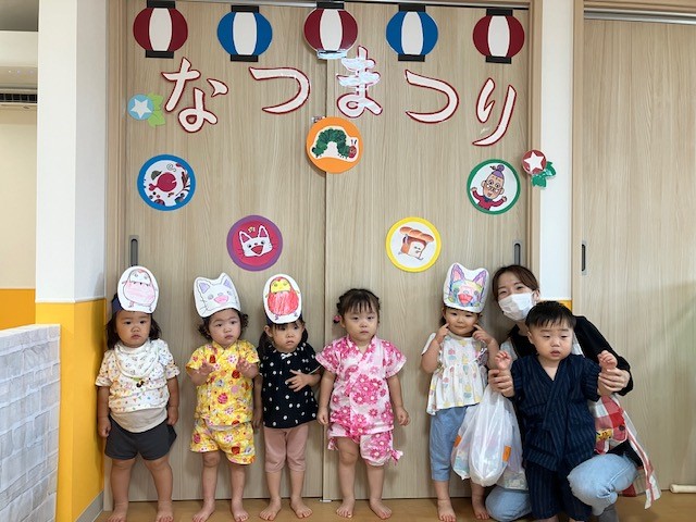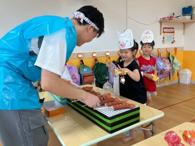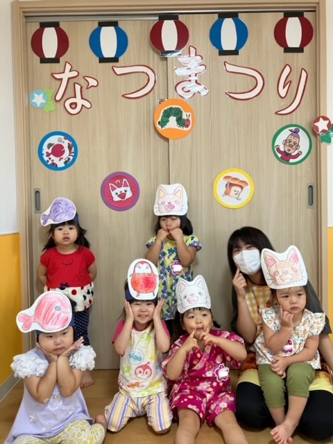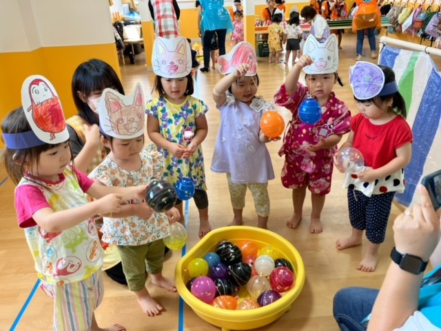 今年はなつまつりのテーマを「絵本の世界」と決め、7月からきりん・くま・ぞう組で協力して準備を行いました。当日は朝から「今日は夏祭りだよね?」と友だちと笑顔で話す姿も多く見られ、園全体がお祭りムード一色でした😊
