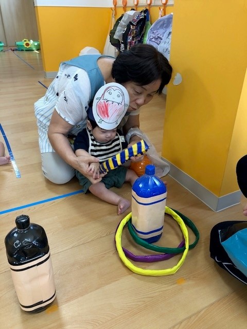 クレヨンくんの輪投げは何本入るかな? こあら組は先生と一緒に「ぽいっ」