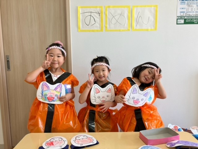 クラスごとにお面屋さんから回ります。「いらっしゃいませ~!!」「どのお面にしますか?」