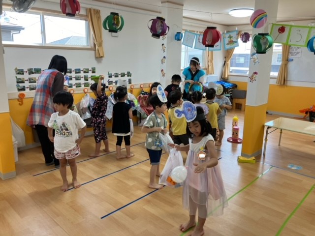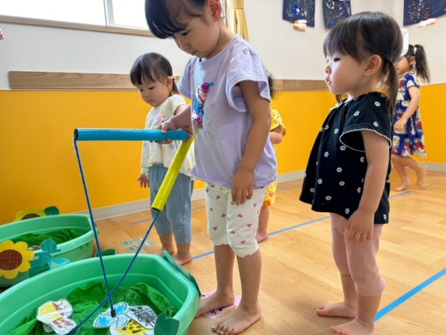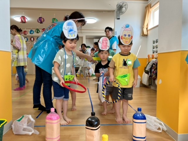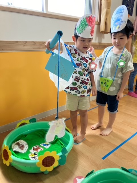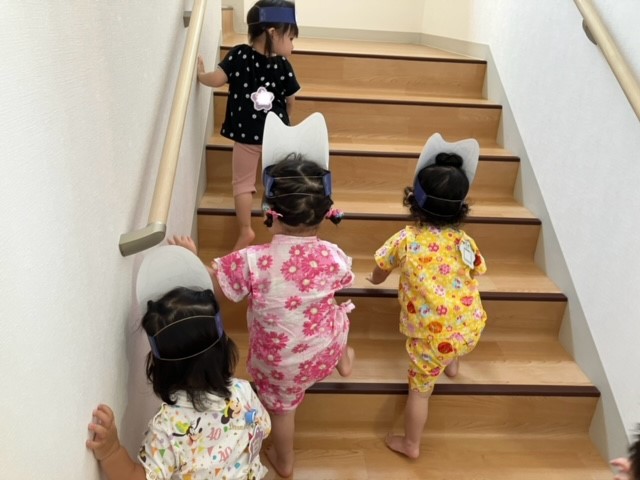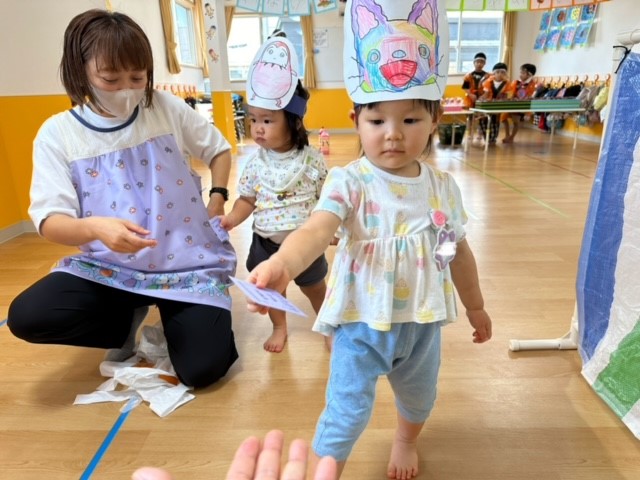 お面をかぶったお友だちから2階のお部屋に移動です。うさぎ組も自分でのぼっていきます「よいしょ、よいしょ」 狙った虫は上手に釣れたかな?小さなクラスのお友だちも、チケットを渡したり並んで待つことが出来ました😊