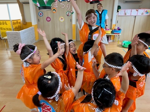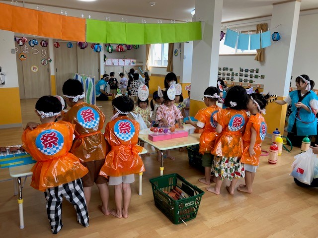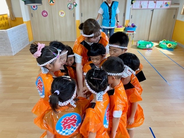 いよいよ夏祭りが始まります!!お店屋さんのぞう組は全員で気合を入れます。「がんばるぞ~、おぉ~~~!!」