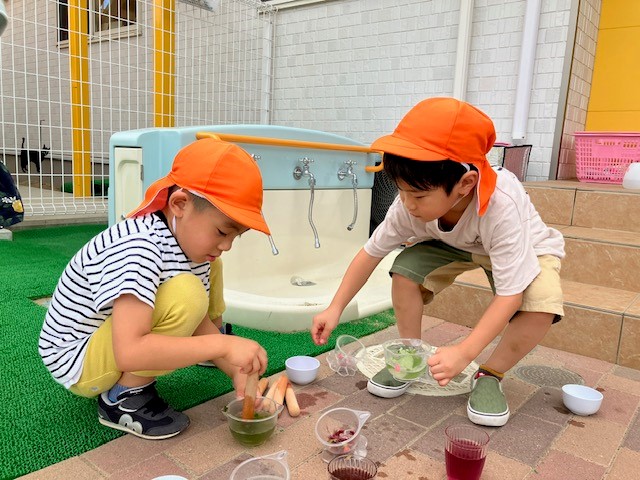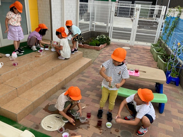 みんなで育てた朝顔で色水遊び 出来上がったジュースを園長先生にもおすそ分け🍹「おいしいよ~」