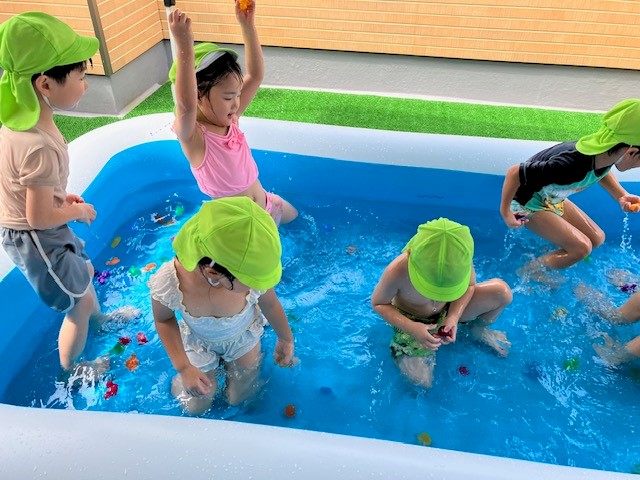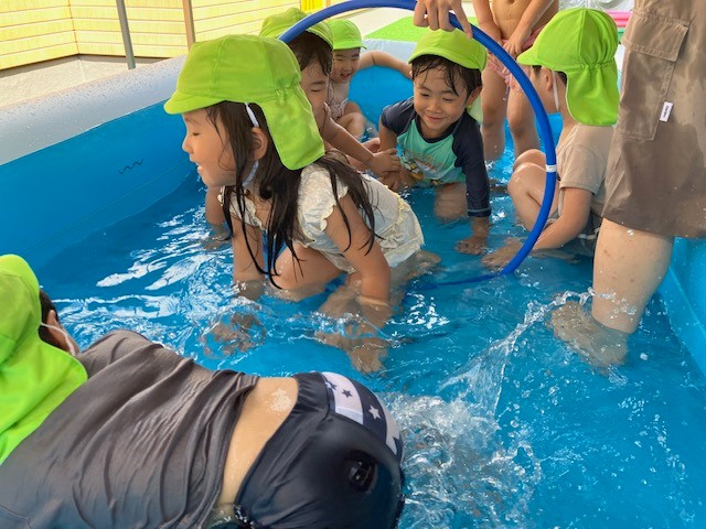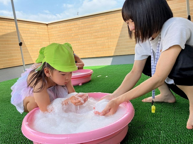 【くま組】プールでは楽しみながら水に慣れていけるように、フープくぐりや水中の宝石探しをしました。たらいにはたくさんの泡を作って泡遊び。息を吹きかけたらどうなるかな~?「せんせい、みててね」