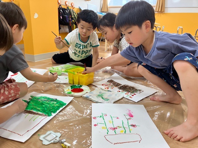 【未満児クラス】氷遊びでは初めはドキドキ遠くから見ていた子も、先生やお友だちの楽しそうな様子から「ちょっとさわってみよう」と興味を持ち、玩具を取ろうと頑張って氷を溶かしていました。 れんこん・ピーマン・人参などを使っての野菜スタンプでは、気に入った形を何度も押したり、重ならないように押してステキな作品ができました。