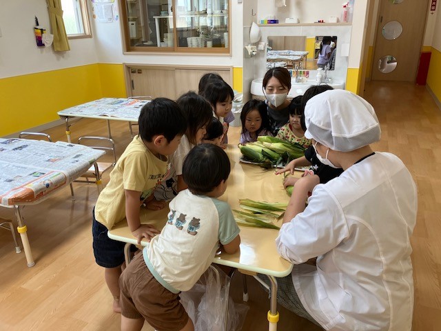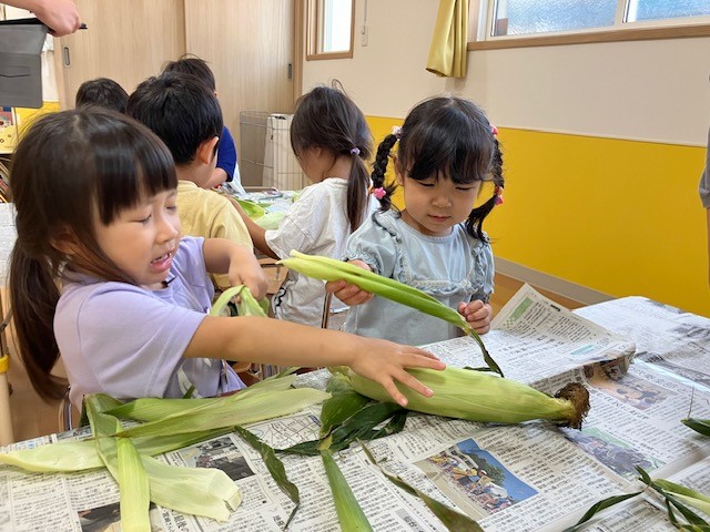 みんなで皮をむいたトウモロコシは、午後のおやつに「とうもろこしおにぎり」と「ゆでとうもろこし」になってみんなでおいしくいただきました😌