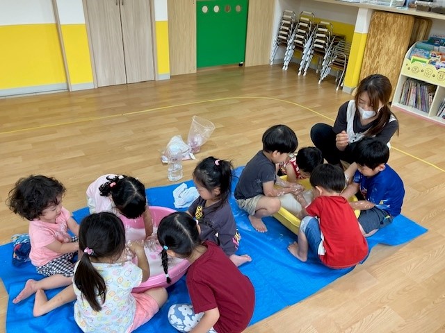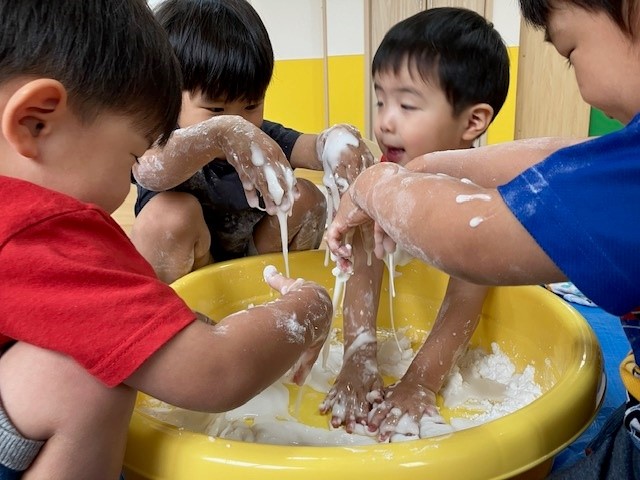 片栗粉あそびでは、水を少しずつ入れながら感触を楽しみました。洋服もお顔も粉まみれになりながらも集中して遊んでいる子ども達の表情はキラキラ🌟していますね