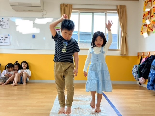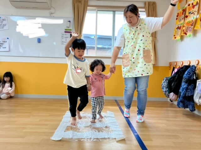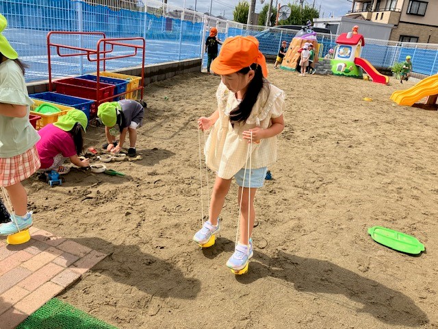 園庭では、『ぽっくり』が新しく仲間入りをして、子ども達は興味津々…順番を守りながらお友だちと仲良く遊んでいました。ぽっくりは楽しみながらもバランス感覚や集中力が養われるようなので、機会があればお家でもいかがですか?