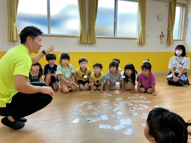外部の先生をお招きしての体操・英語教室はくま・ぞう組に大人気✨ 体操では鉄棒の前回りや逆上がりを先生に補助してもらいながら真剣に取り組み、英語では同じ形のカードをお友だちより早く見つけようと、先生の説明をしっかり聞いています。 体操・英語教室で褒められたり、頑張りを認めてもらえることは、子ども達にとって次の活動への自信につながっているようです。