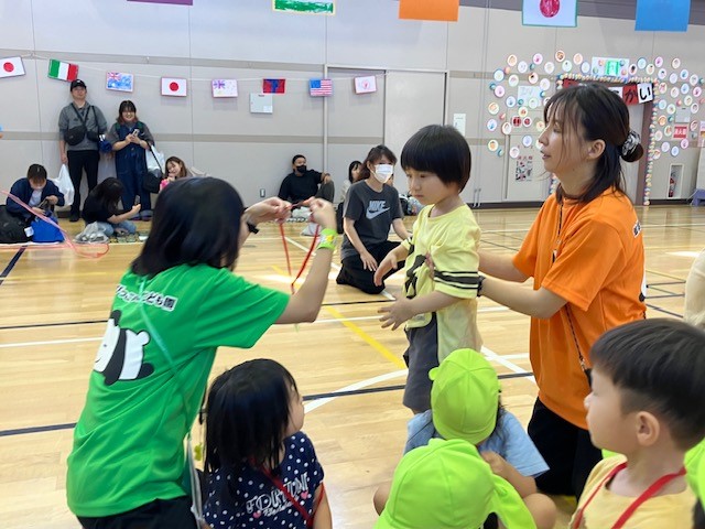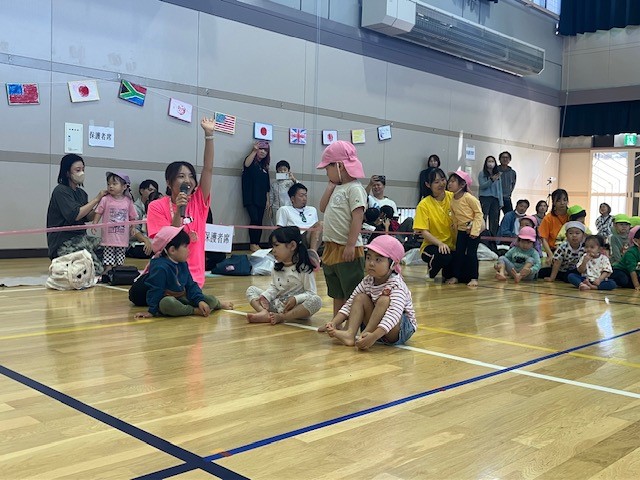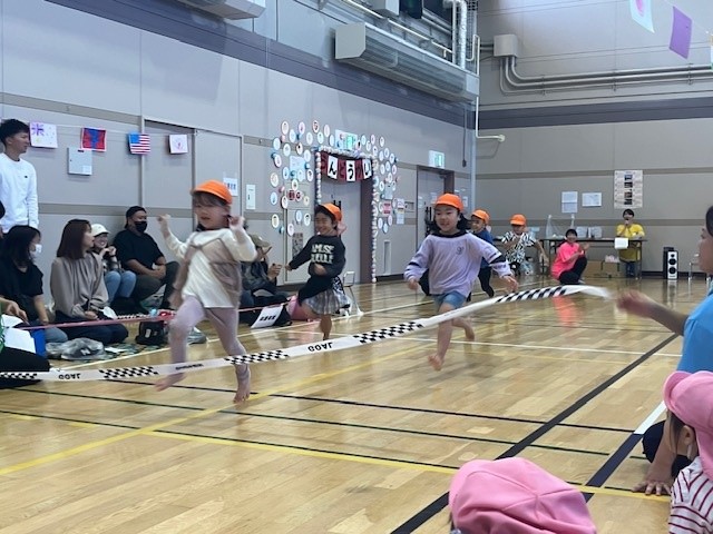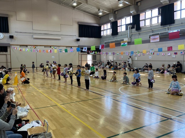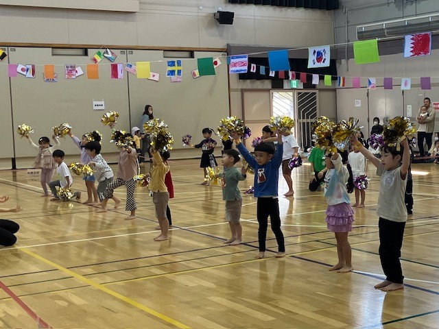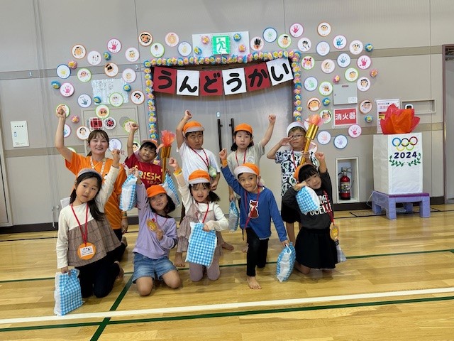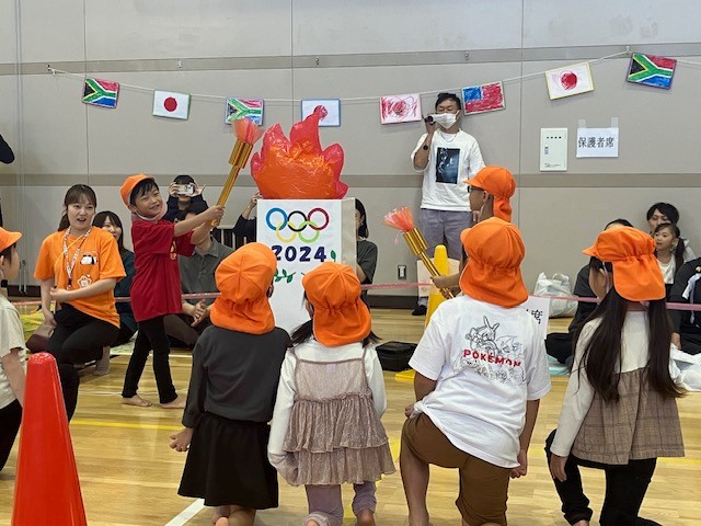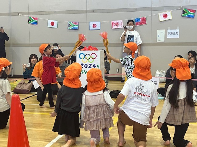 お家の方が一緒ということで嬉しそうに笑顔で登園する子、不安そうな表情でお家の方と離れられない子などいつもとは違う子ども達の様子が見られましたが、オリンピックイヤーということで開会式ではに聖火点灯も行い、準備体操では「PONPONポップコーン体操」を元気いっぱい踊りました