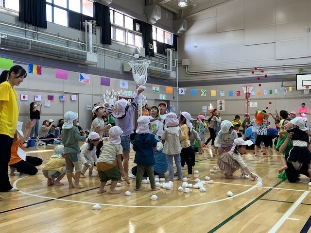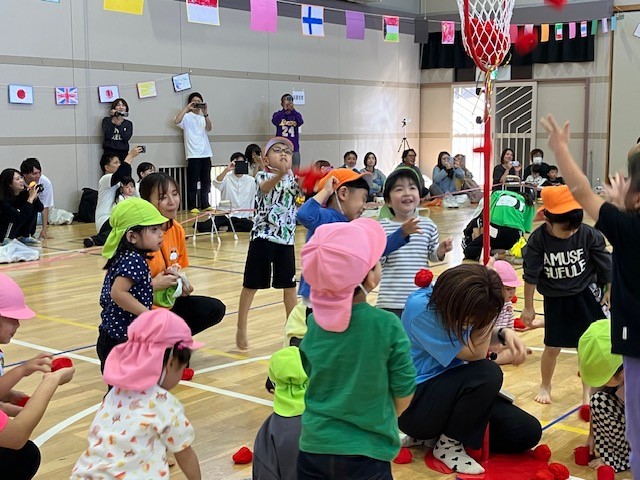 玉入れでは、赤・白チームに分かれて力を合わせて頑張りました 一つ一つ狙いを定めて投げたり、沢山の玉を一度に投げたりと勝つ為の工夫も見られました