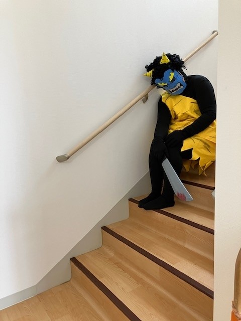 青鬼が登場すると、「きゃ~~~~~💦💦」の悲鳴と共に逃げ回ったり先生の後ろに隠れたり、鬼を倒そうと何度も新聞紙豆を投げるお友だちもいました