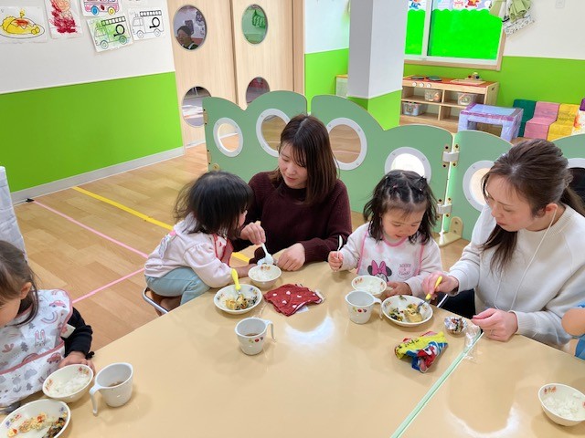 2月は未満児クラスが保育参観、以上児クラスが懇談会を行いました 今年度は初めて給食・おやつ試食を実施し、保護者の皆さんに子ども達がいつも食べている物を少しですが味わっていただきました