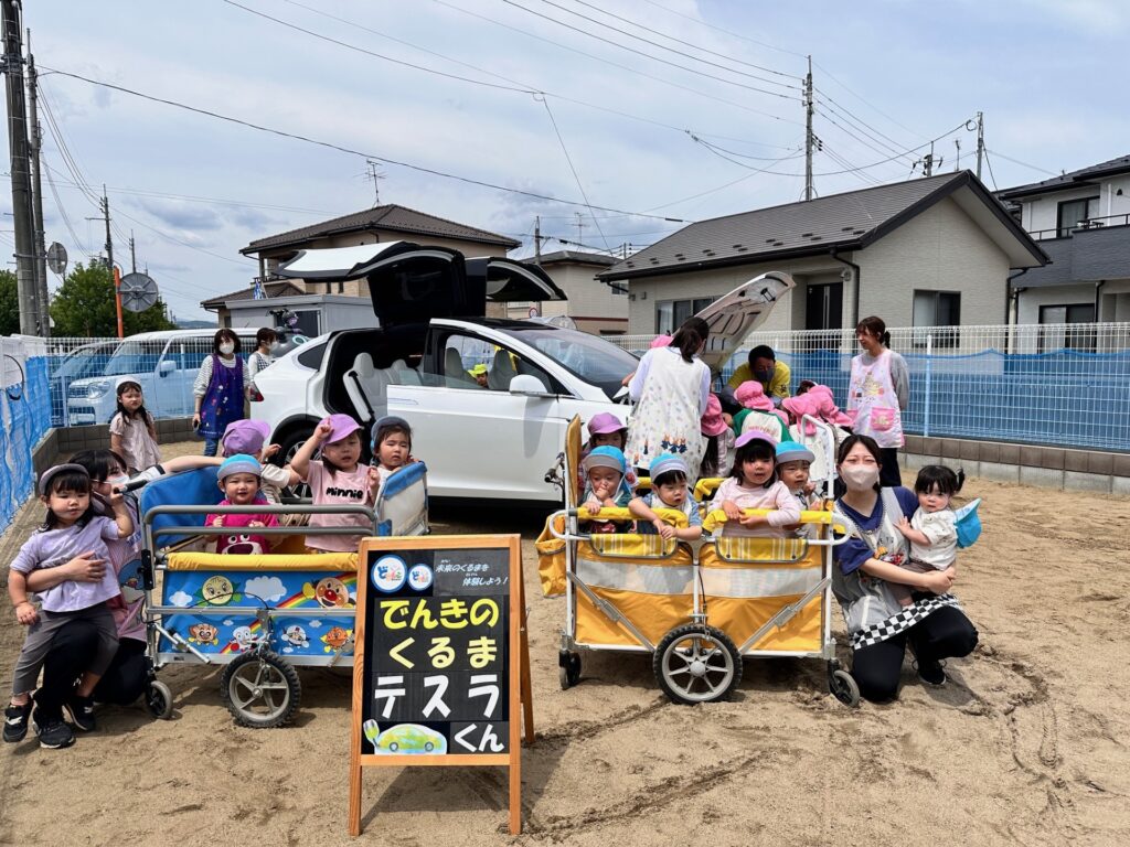 5/2には北海道から電気自動車「テスラ」が遊びに来てくれました🚗 担当の方からの電気自動車についての話を聞いた後に「テスラ」が音楽に合わせて踊ってくれました(扉が開閉したり、ライトが点滅したり…) 子ども達は目を輝かせてテスラダンスを楽しみました
