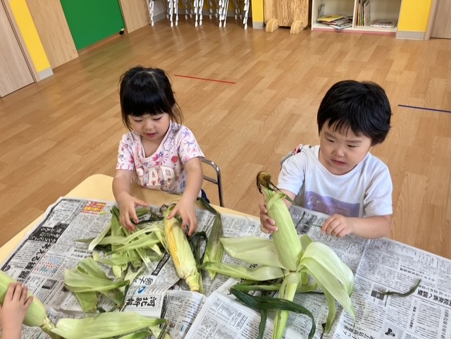 おやつで「とうもろこしおにぎり」を食べました コーンがいっぱい入った甘いおにぎりで子ども達に大人気です🌟
