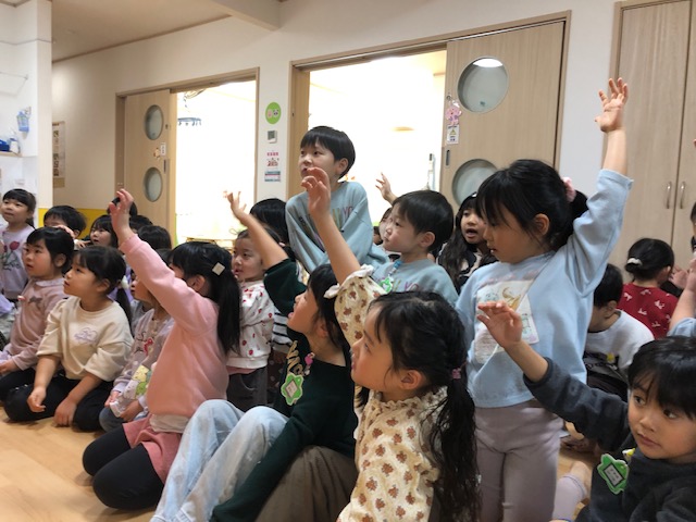 お題を出していた園長が間違えて次の答えを子ども達に見せてしまい、子ども達は「えっ?!」先生達は「園長先生、やってしまいましたね💦💦」の表情に…その後、ホールは大爆笑になりました😂😂😂 そんな園長の肩を優しく「大丈夫ですよ」とトントンするこーすけくんは可愛かったです(写真が取れなかったのが残念💦)