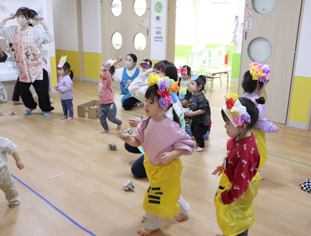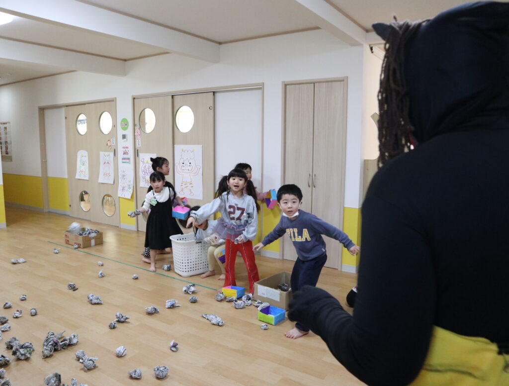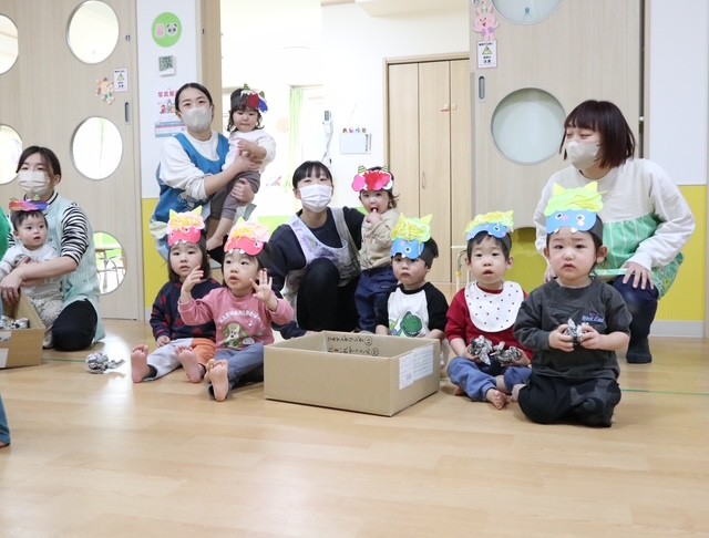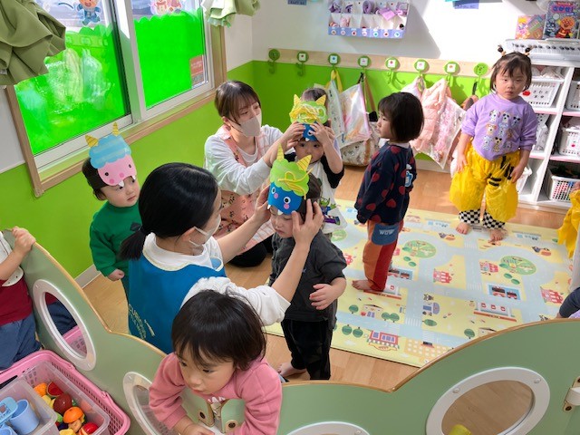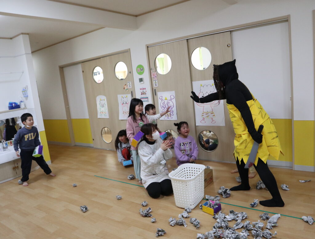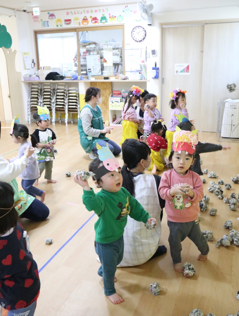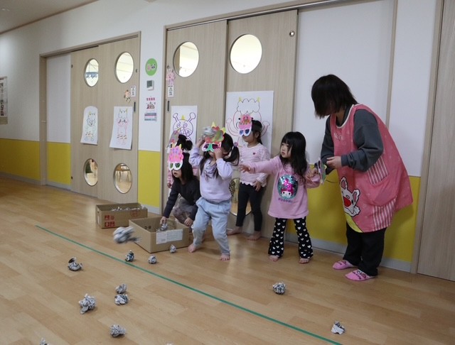 未満児クラスはお面をつけるのも嫌がる子もいましたが、壁に貼ってある鬼への「おには~そと~」は元気いっぱい行うことが出来ました。まだまだ笑顔の子ども達😊