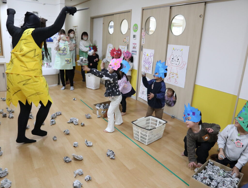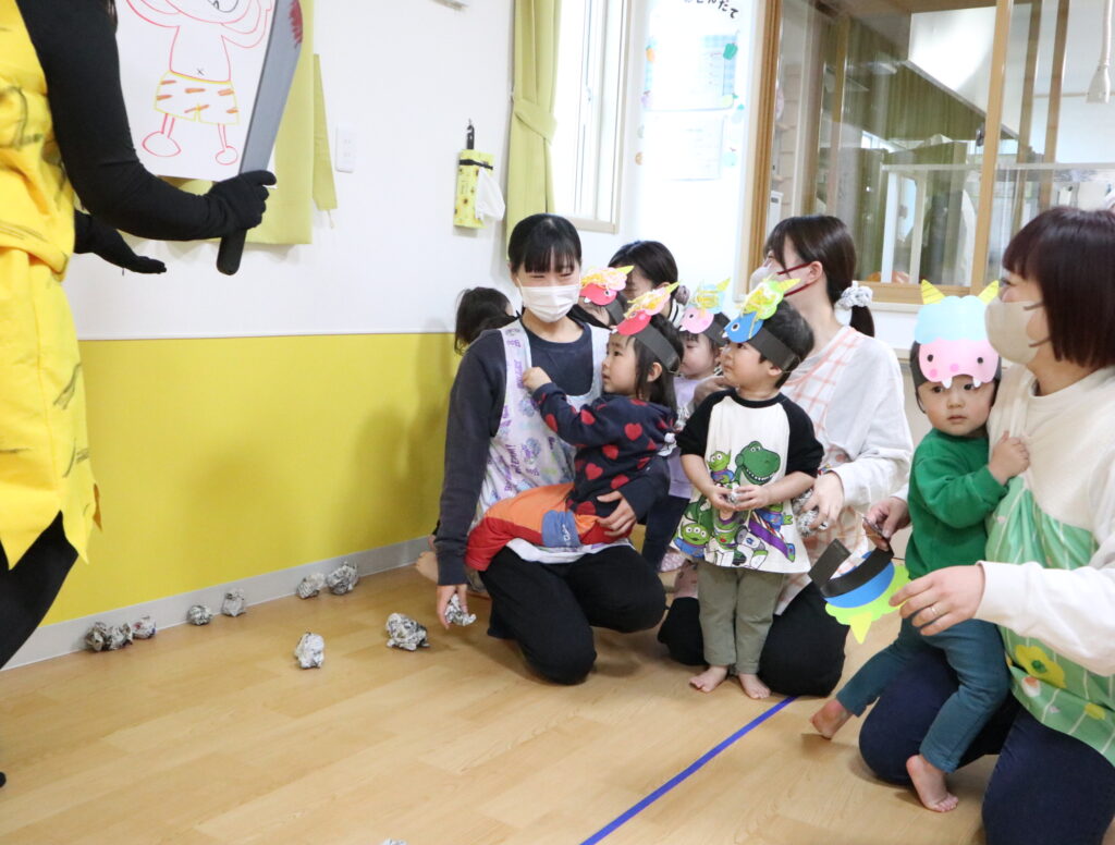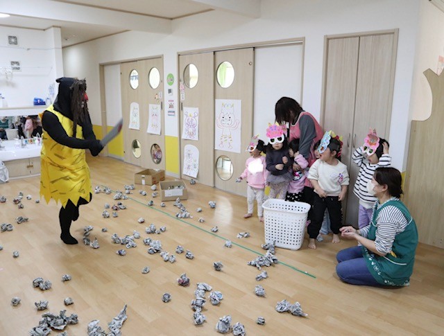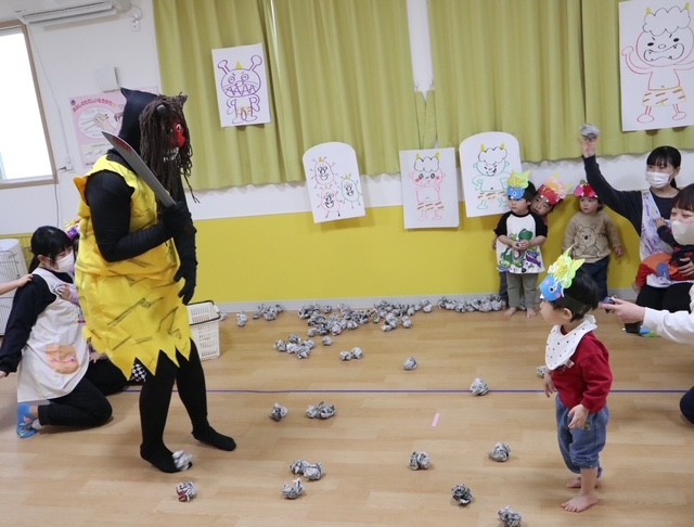 鬼が出てくると子ども達の表情が一気に変わり、ホールには泣き声が😭😭😭 鬼に向かって果敢に挑む1歳児さんもいましたが、やはり先生達の後ろに静かに隠れている子が多かったです