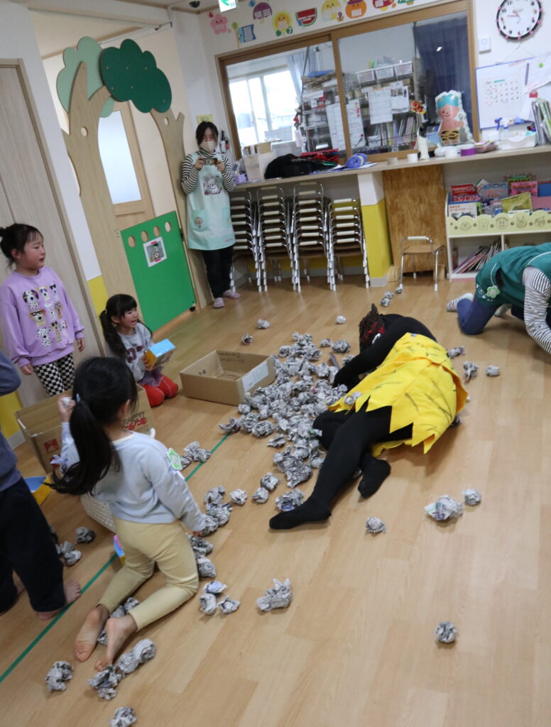 以上児クラスでは、先生達の想像以上に怖がる子が多く、今年は泣き泣き泣き😭😭😭の節分になりました