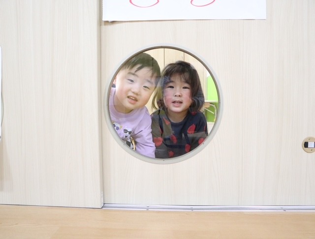 扉越しに笑顔で、鬼の様子を見ている未満児さん😊 ここなら鬼さんも来ないから安心だね